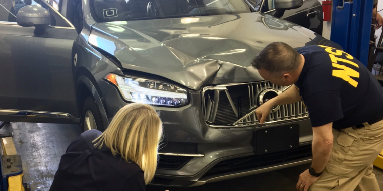 / NTSB officials inspecting the vehicle that killed Elaine Herzberg in a March crash in Arizona.