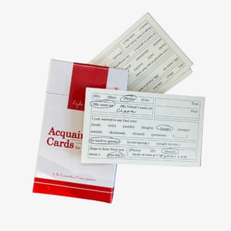 Even the design of the card holder – the red and white packaging of a retro cigarette case – draws from an era before dating apps: “So much of vintage cigarette ads are based on flirting and making a move,” Lee said. “I like what you like,” reads one 1930s example picturing a man and woman happily smoking together.