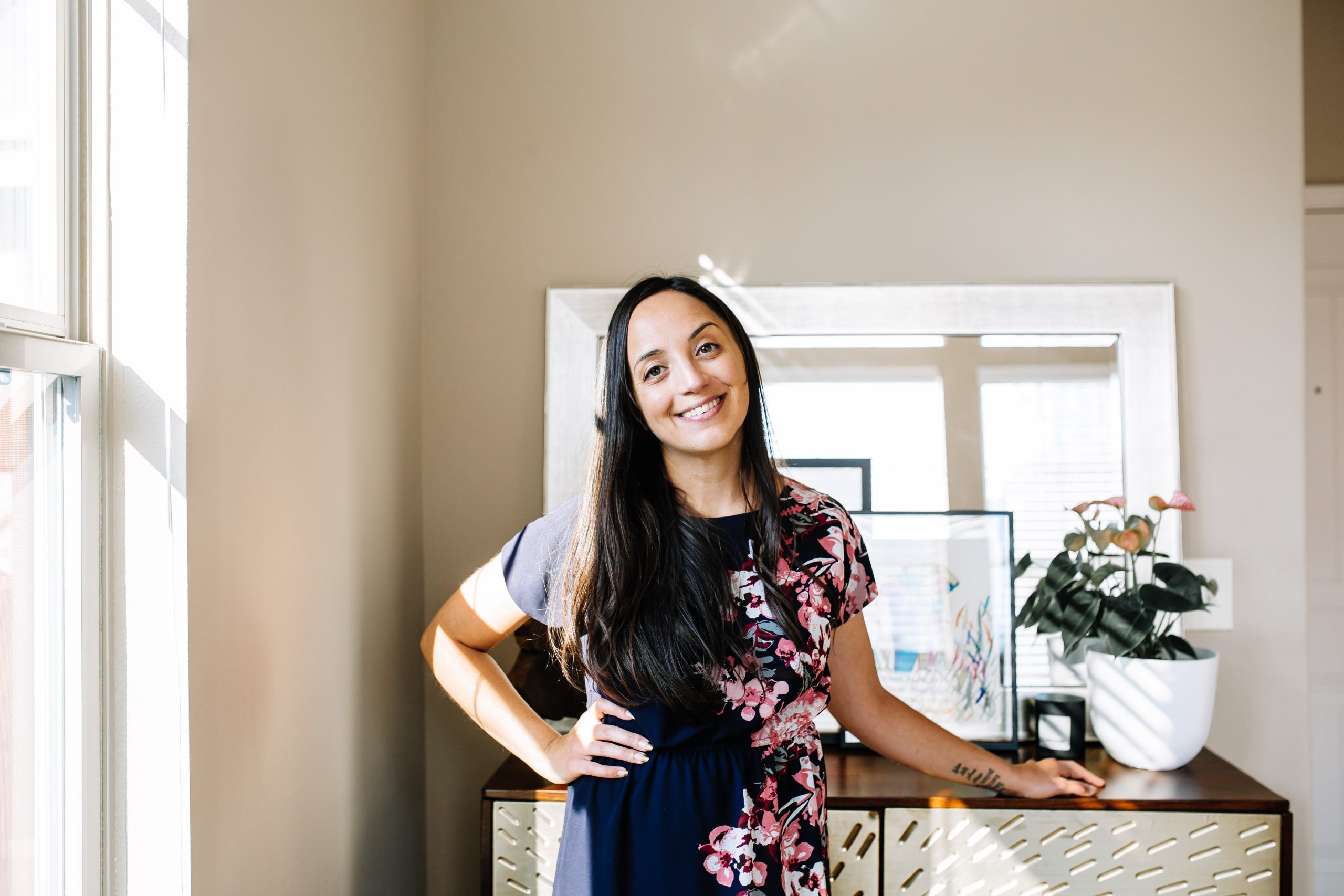 A woman in a floral dress smiling at the camera, with a plant and mirror in the background.