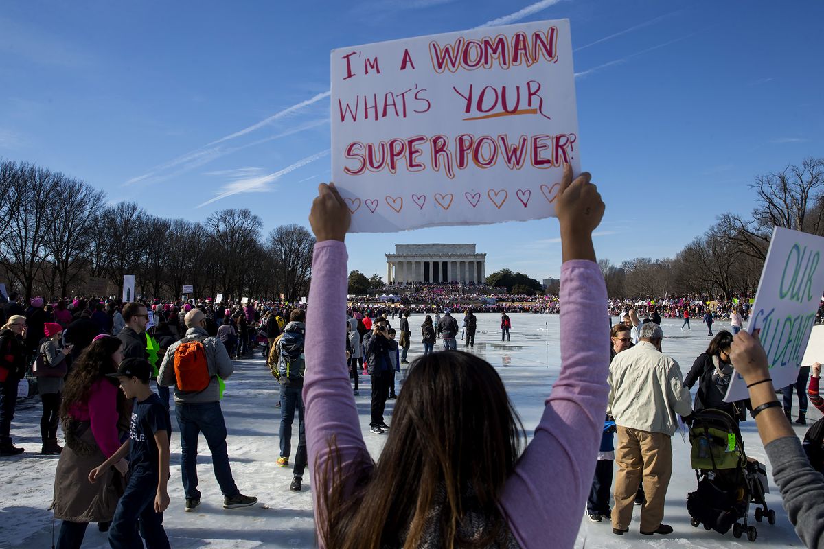 A woman holds a sign at the reflecting pool during the Women's March on Washington.