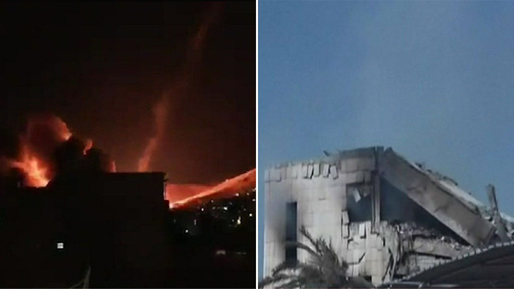 Media captionAmateur footage shows strikes on a military research facility in Damascus, while state TV shows the damage