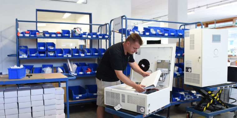 / An employee working for the manufacturer of solar batteries, Sonnen GmbH, in the Bavarian village of Wildpoldsried in southern Germany is pictured on July 5, 2016.