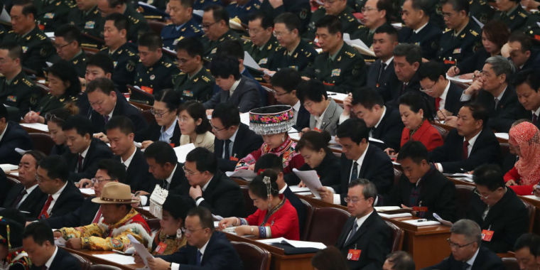 / Deputies of the 13th National People’s Congress listen to Chinese Premier Li Keqiang’s speech during the opening of the Two Sessions at The Great Hall of People on March 5, 2019 in Beijing, China.