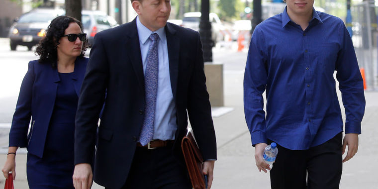 Enlarge / Hutchins, right, walks to court with his lawyers in 2017.