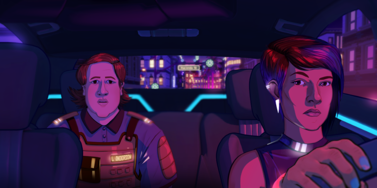 <p><a data-height=Enlarge / Yes, this passenger pukes in your cab’s backseat. It’s both the least and most of your concerns as a near-future gig-economy driver in the surprisingly stirring Neo Cab.