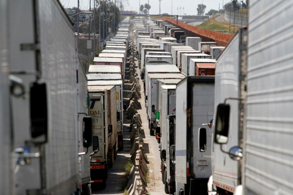 FILE PHOTO: Trucks wait in a long queue for border customs control to cross into the U.S. at the Otay border crossing in Tijuana, Mexico April 2, 2019. REUTERS/Jorge Duenes/File Photo