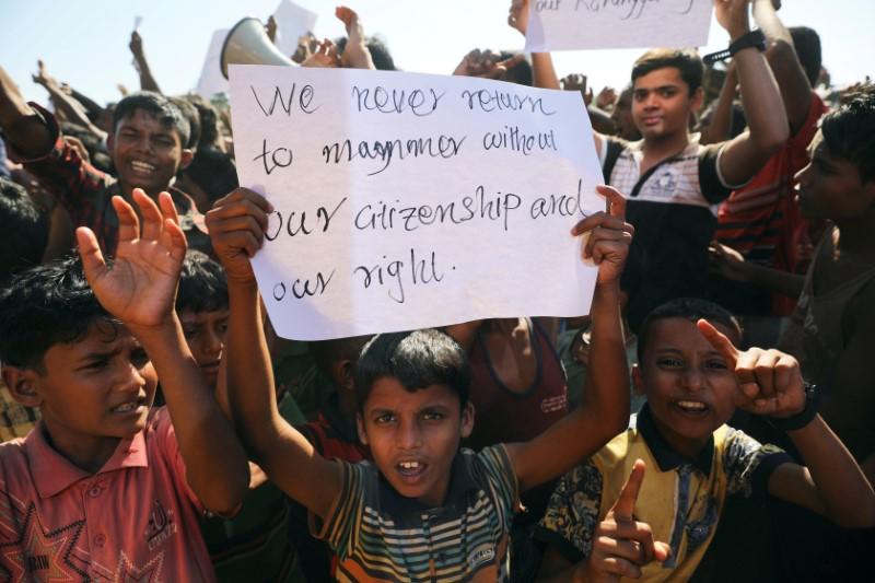 FILE PHOTO:A boy holds a placard as hundreds of Rohingya refugees protest against their repatriation at the Unchiprang camp in Teknaf, Bangladesh November 15, 2018. REUTERS/Mohammad Ponir Hossain