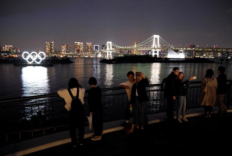People take selfies in front of the giant Olympic rings at the waterfront area at Odaiba Marine Park in Tokyo, Japan, March 22, 2020. REUTERS/Issei Kato