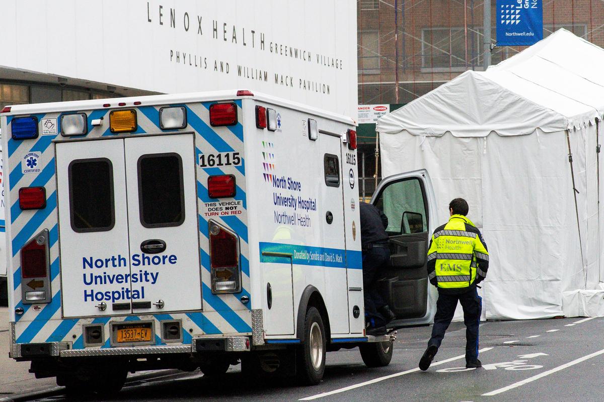 A paramedic walks next to a makeshift morgue set outside Lenox Health Medical Pavilion as the coronavirus disease (COVID-19) outbreak continues in New York, U.S., March 29, 2020. REUTERS/Eduardo Munoz