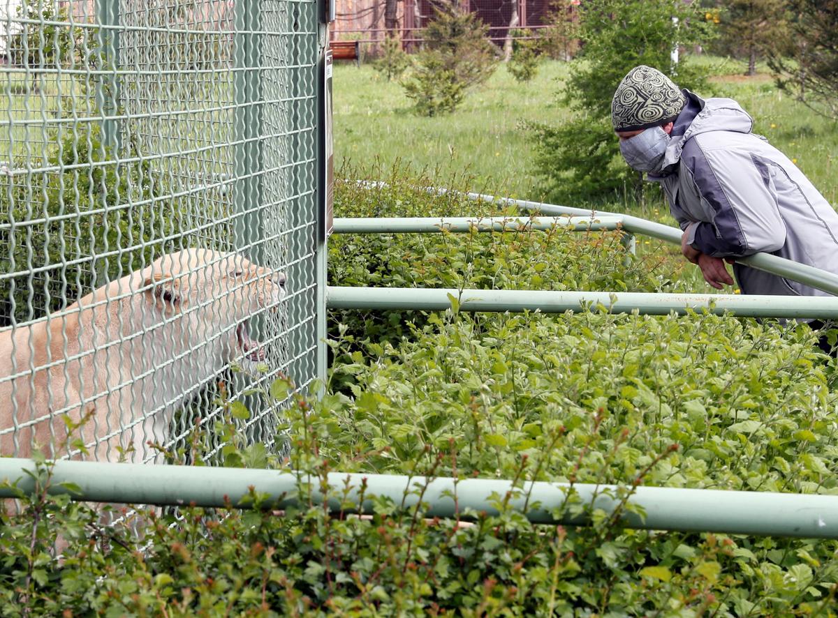 A white lioness growls in her enclosure, as an employee looks on, at an empty private zoo called “12 Months” in the town of Demydiv, Ukraine May 8, 2020. The private zoo, which closed its doors to visitors during Ukraine’s novel coronavirus lockdown, has almost run out of money and can barely cover utility bills to maintain conditions for its animals. Picture taken May 8, 2020. REUTERS/Gleb Garanich