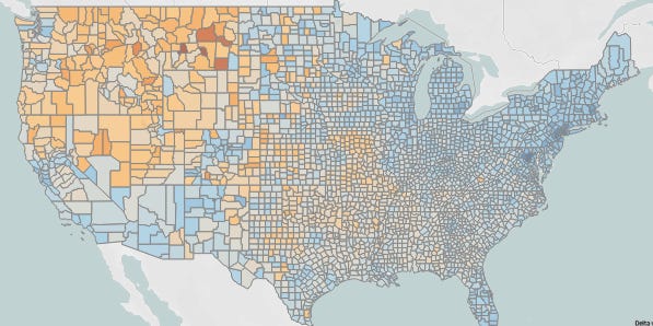 By contrast, data from the past week shows far more mobility, with some counties experiencing even more people moving around than the year prior, reflected by more orange counties.