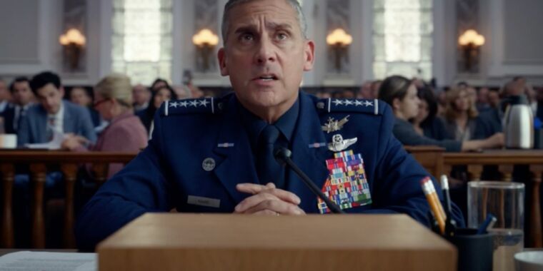 We get to see even more of this tension between Mark and Mallory in the new trailer, as Mallory’s insistence on hard science repeatedly throws cold water on the optimistic aspirations of Space Force. When Mark draws a straight line to illustrate the surface of the moon (“flat, desolate”), Mallory chimes in: “The surface is actually a complex topography….” In another scene, Grabaston brings his own team to take on the Space Force recruits in a competitive training exercise (“We’re going to eat your guts”), prompting Mark to muse, “So the game of mental chess has begun.” Mallory can’t resist a bit of snark: “It’s Hungry Hungry Hippos at best.”