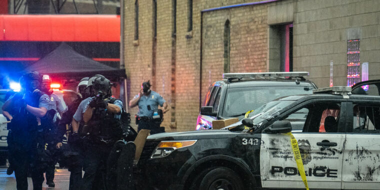 Enlarge / Minneapolis police fire tear gas at those protesting the May 25 death of George Floyd.
