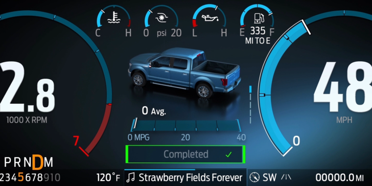 “The idea is it presents information in a very directed way so that it almost behaves like a concierge. So it’s presenting the most important information and being able to move things around in a digital environment to make room for other content that’s perhaps more important,” said Mark Sich, F-150 digital designer at Ford. The move away from a skeuomorphic UI required some testing with Ford’s truck customers, Sich told Ars. “What we discovered was that, as long as the information is presented in a real, digestible, understandable, hierarchical way, they were willing to really take that leap of faith.”